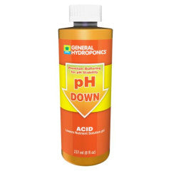 The acid formulation uses food grade phosphoric acid to lower the pH to the proper level. Widely recognized as a consistent and reliable product.General Hydroponics pH Down Liquid